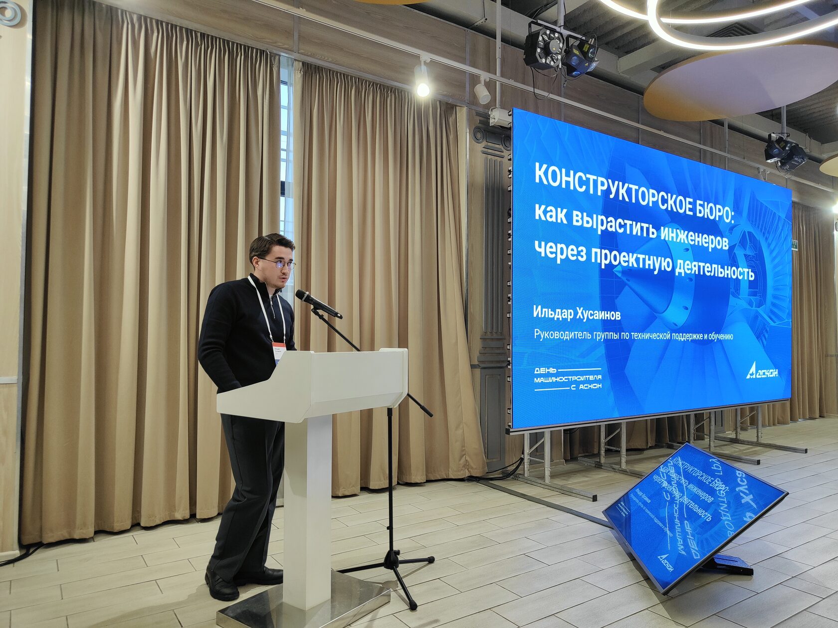 Ильдар Хусаинов, руководитель группы технической поддержки и обучения АСКОН-Уфа, рассказал о сотрудничестве АСКОН и учебных заведений в формате организации конструкторского бюро для будущих инженеров.